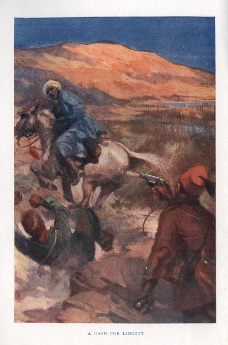 The obvious course was to release Rejeb, who would no doubt continue in the direction he had been going, and as soon as he was out of sight, to take refuge in the subterranean room until the chase was past. But the young chief was jaded, worn out by his hurried flight and the subsequent struggle on the tell. It was almost certain that he would be run down. Burnet had taken an instinctive liking to him; he could not give him up to his enemies, who were at the same time enemies of the British. After a few moments' reflection he turned suddenly to the Arab and said: