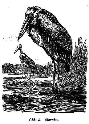 Im Dezember 1910 reiste ich wieder einmal am Rikwasee entlang. Ich befand mich auf dem Heimwege nach Langenburg und hatte vier geangelte Marabus (Leptoptilus crumeniferus Less., siehe Abb. 3), junge Wildkatzen (Felis ocreata Gm.), eine Python-Riesenschlange und noch verschiedene andere Tiere zur Bereicherung meines Tierparkes bei mir. Die Tierkarawane bildete die Spitze, da die Käfige mit Inhalt leichter waren als die übrigen Lasten.