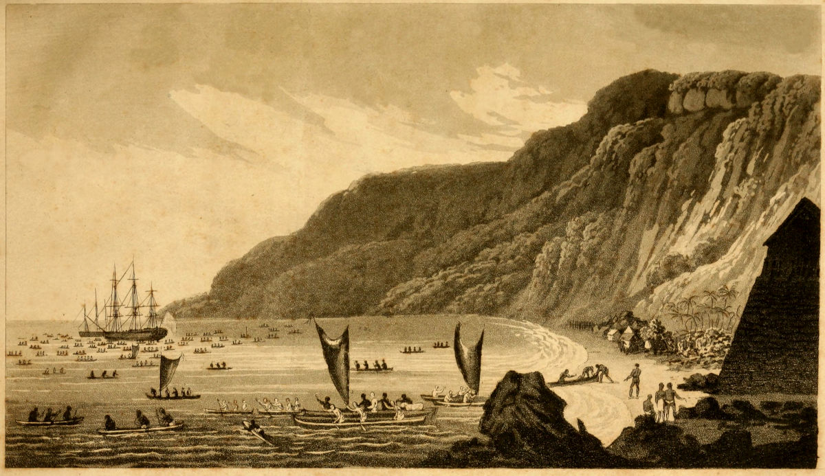 Early in the morning of the 4th, we unmoored, and sailed out of the bay, with the Discovery in company, and were followed by a great number of canoes. Captain Cook’s design was to finish the survey of Owhyhee, before he visited the other islands, in hopes of meeting with a road better sheltered than the bay we had just left; and in case of not succeeding here, he purposed to take a view of the south-east part of Mowee, where the natives informed us we should find an excellent harbour.