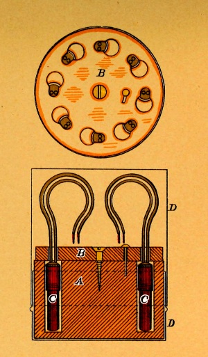 In the center of each cover, around the hole for the entrance of the leading-wires, is a brass rim fitted with a screw-thread outside, and bored out, inside, with a slightly conical taper, providing a seat for the packing.
