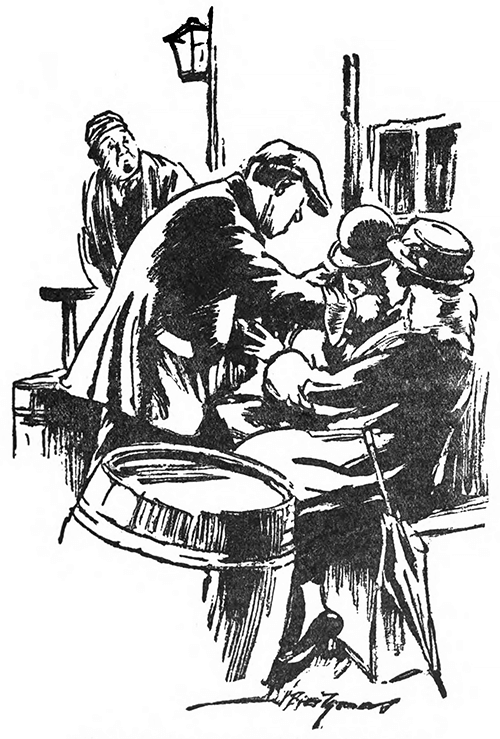 “I got my ladder and lit the lamps. It was dark by the time I ’ad finished and ’ad a pipe in the office. I went out on the wharf again, and arter a time I began to fancy things. I thought I ’eard little rustlings and whisperings. Twice I stopped and listened and then everything was as silent as the grave. Then I ’eard a little sneeze.