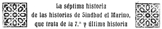 | LA SÉPTIMA HISTORIA DE LAS HISTORIAS DE SINDBAD EL MARINO, QUE TRATA DEL SÉPTIMO Y ÚLTIMO VIAJE | 155-175 |
